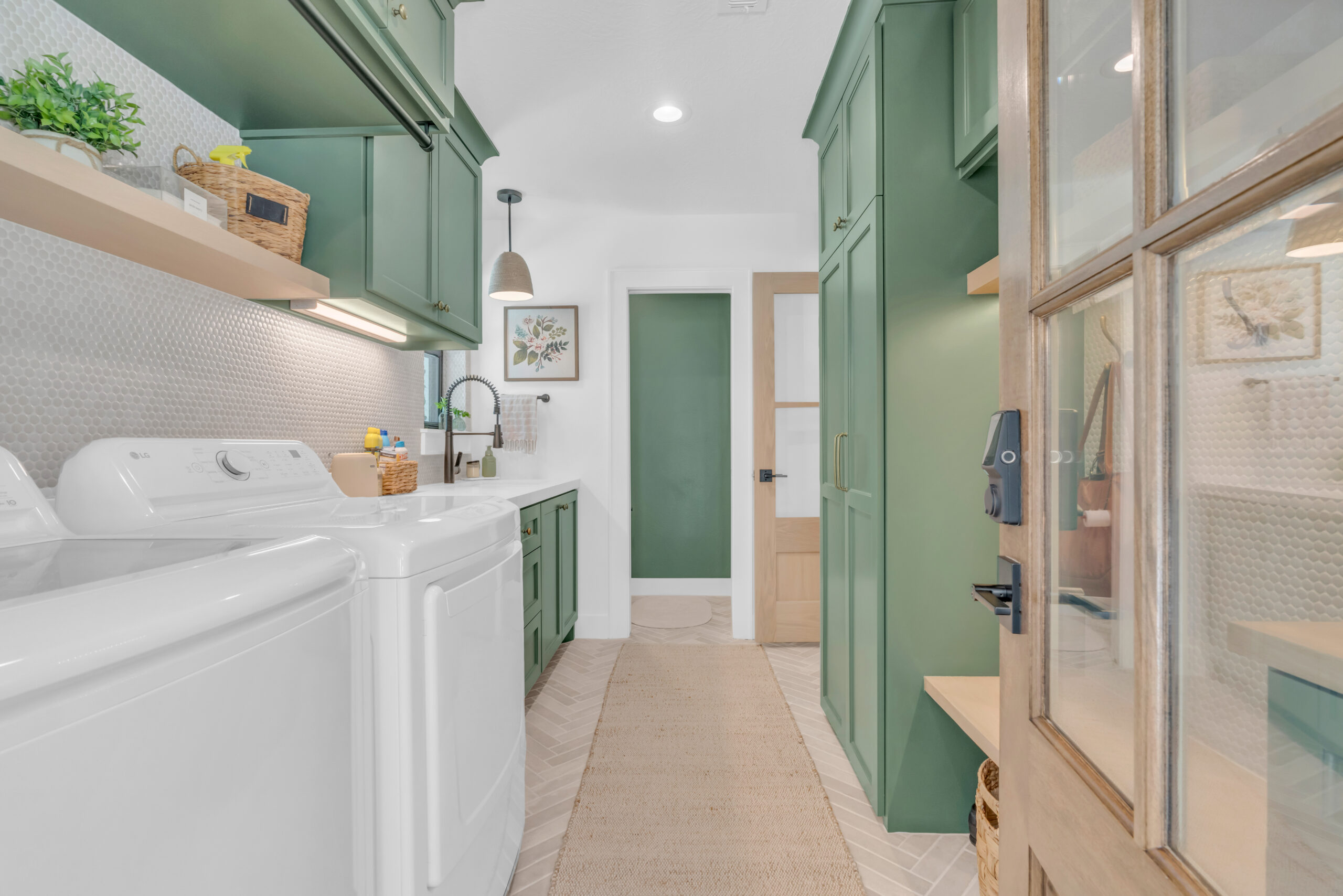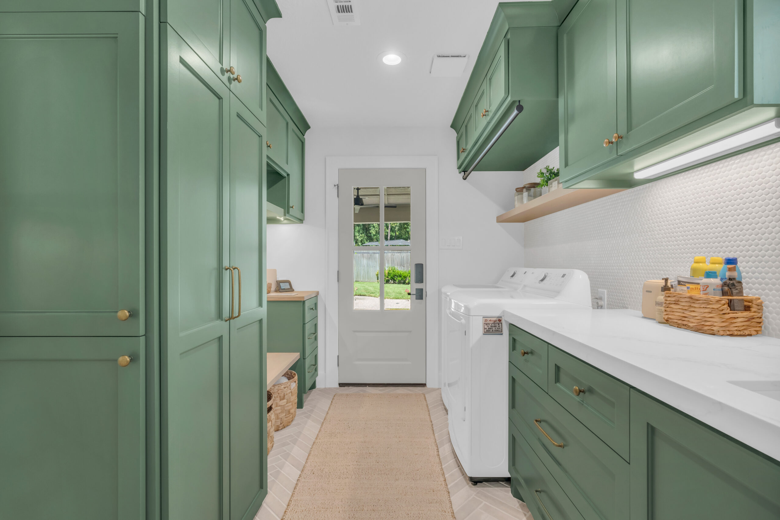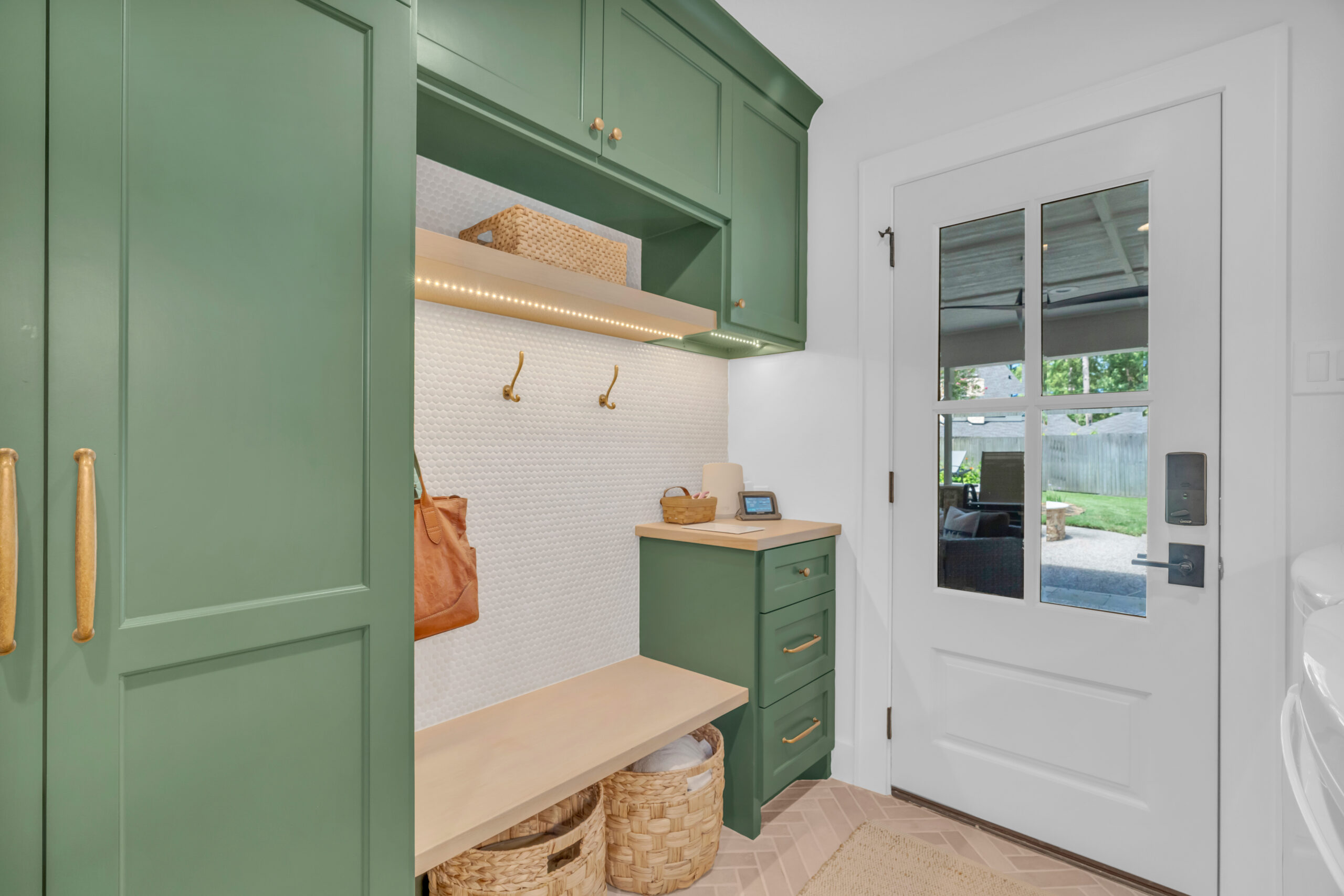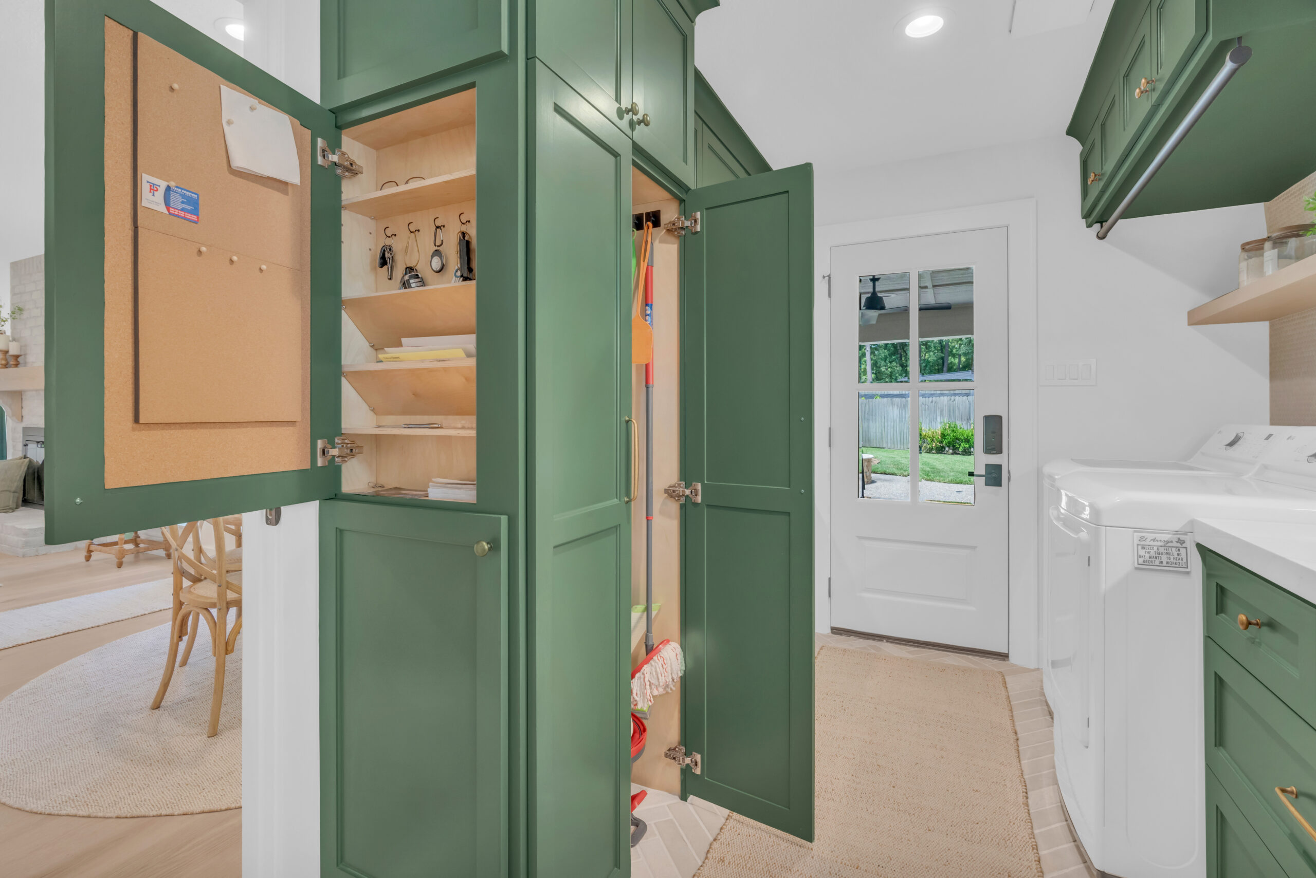 Another exciting and distinctive feature of this space is the spacious, custom-designed storage cabinet. This cabinet was thoughtfully created with specific functions in mind, such as a designated area for your mail and keys when you arrive home. It also includes a spot for tall brooms and mops, as well as space for all those items that need to be tucked away yet remain easily accessible!