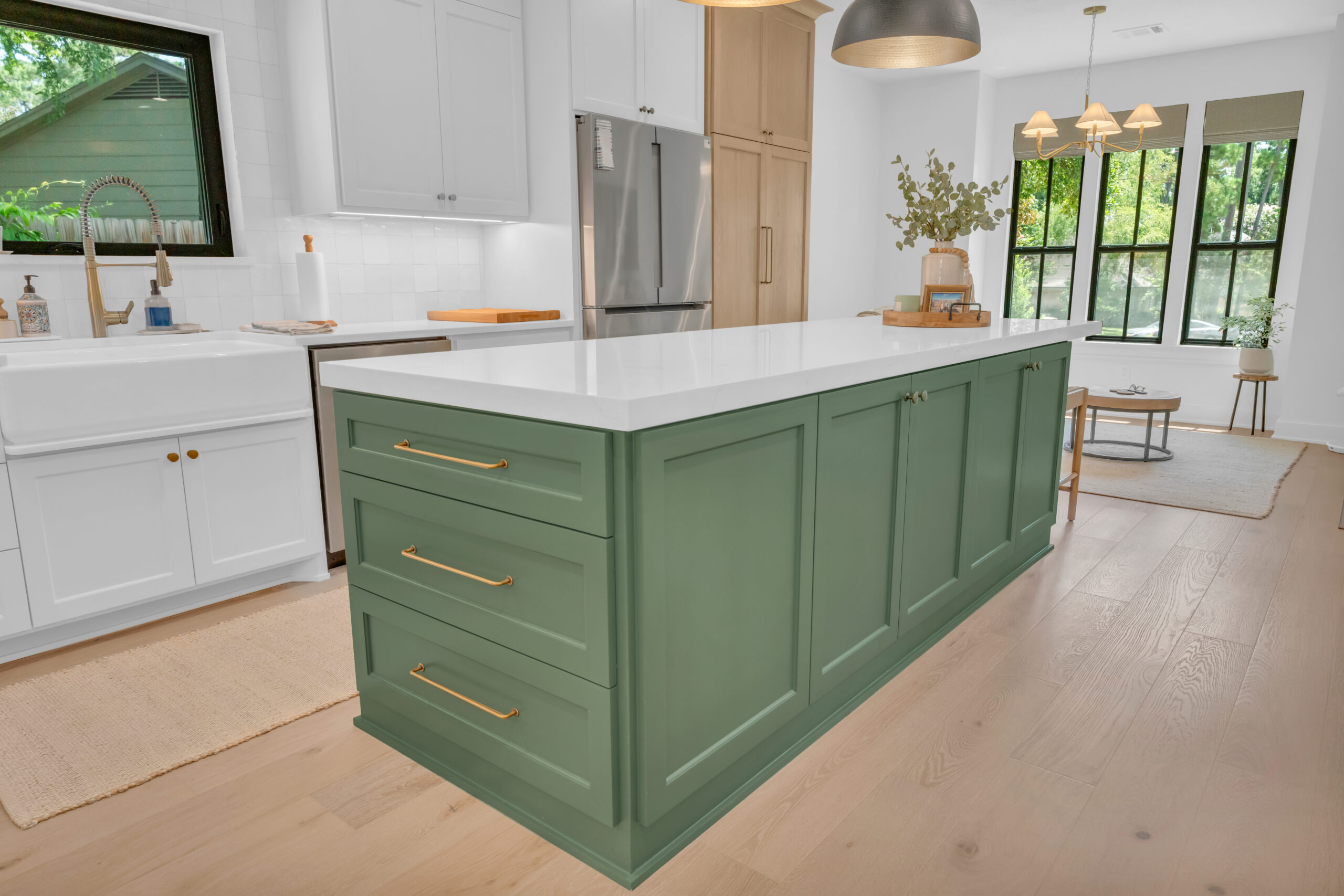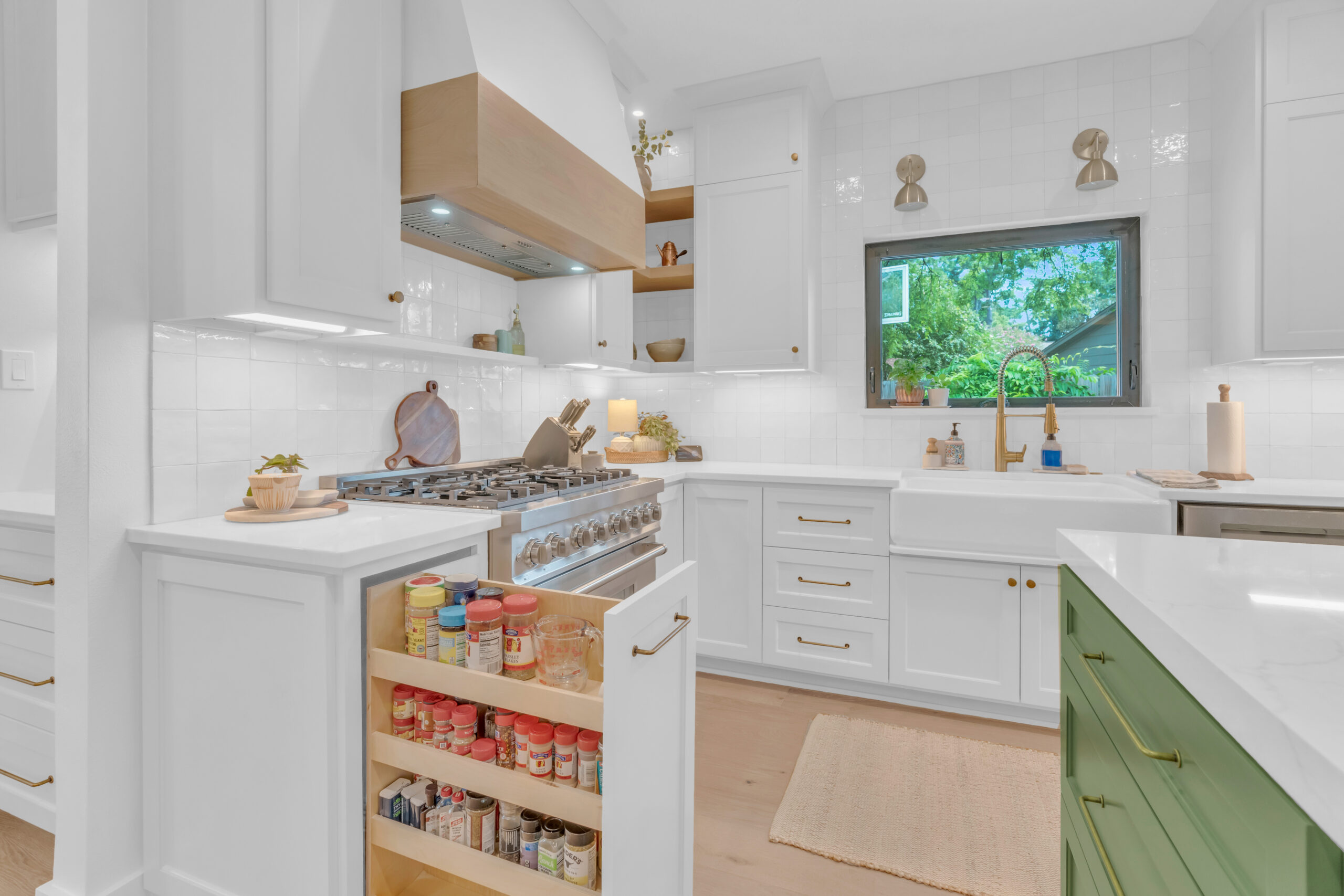 Another charming feature is the tall wooden accent cabinet, which serves as the pantry, introducing a cozy, rustic touch that beautifully complements the green island. This wooden element is also present on the range hood, adding to the cohesive design.
