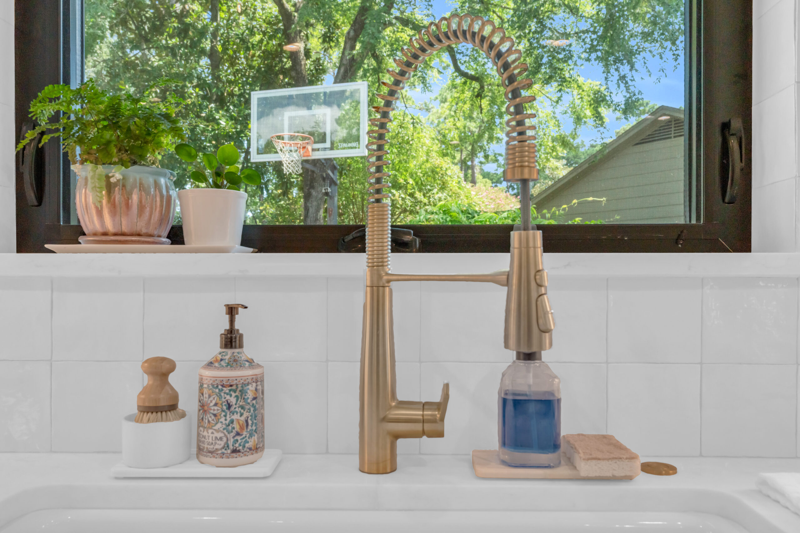 The white countertops and backsplash create a stunning backdrop for the bold accents, allowing the kitchen to maintain a sleek and calm aesthetic. The lighting fixtures and faucet serve as statement pieces, offering a modern and luxurious finish to the overall design.